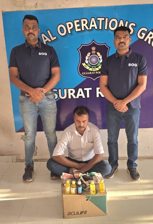સુરત ગ્રામ્ય પોલીસ અધિક્ષક રાજેશ ગઢિયાની સૂચના મુજબ એસ.ઓ.જી.ની ટીમે બાતમીના આધારે નવાપરા પાયલ કોમ્પ્લેક્સની બાજુમાં આવેલ ઘનસુખકાકાની રૂમમાં દરોડો પાડ્યો હતો. અહીં મેડિકલ ડિગ્રી કે રજીસ્ટ્રેશન વગર પ્રેક્ટિસ કરતા સંજયભાઈ સુભાષભાઈ મુર્ખજી (ઉ.વ.૪૩) ને તબીબી સાધનો અને દવાઓ સાથે પકડી પાડવામાં આવ્યો હતો.